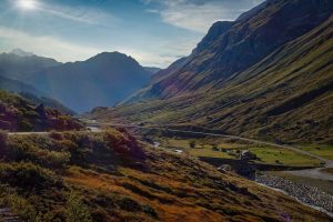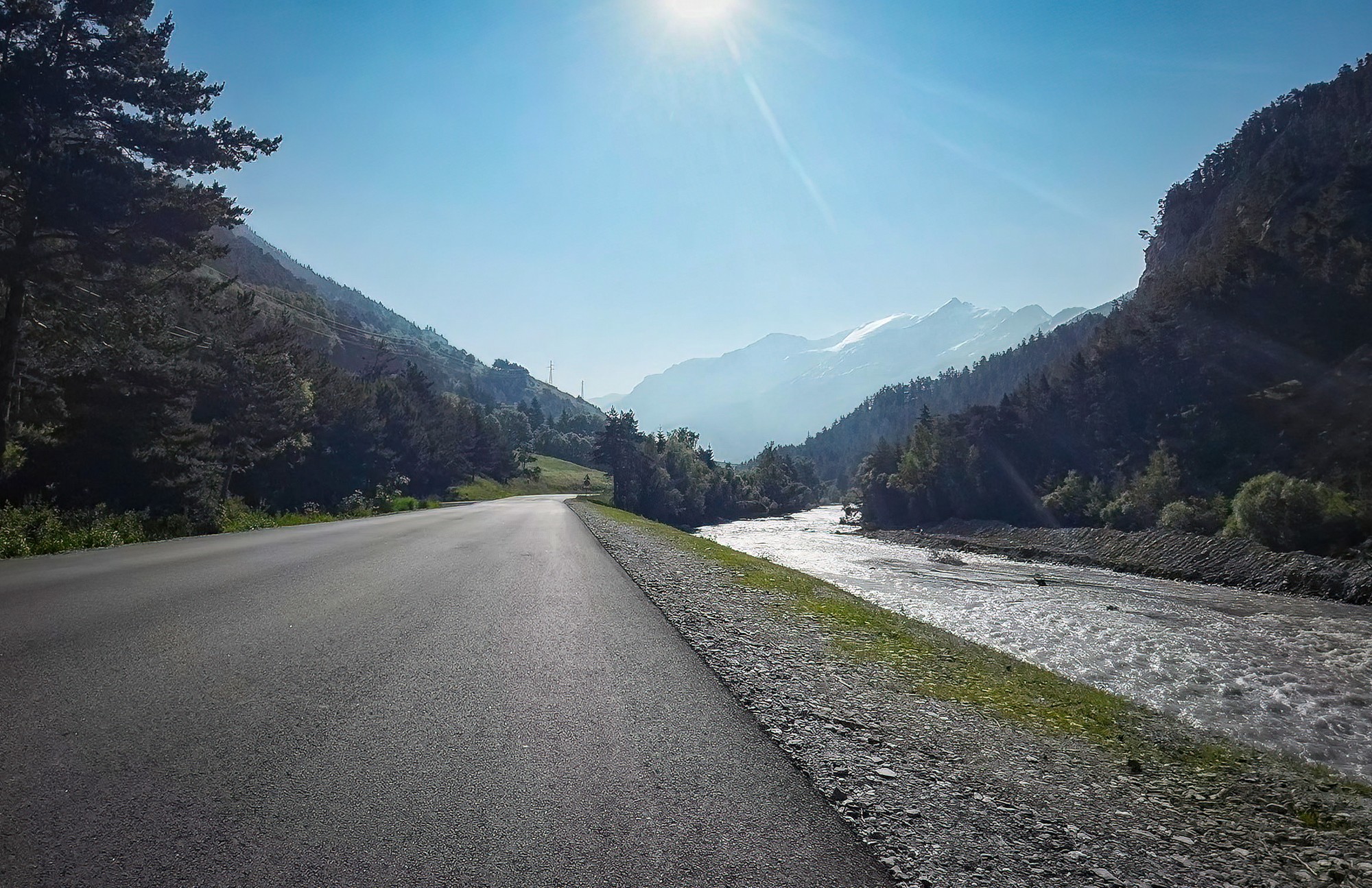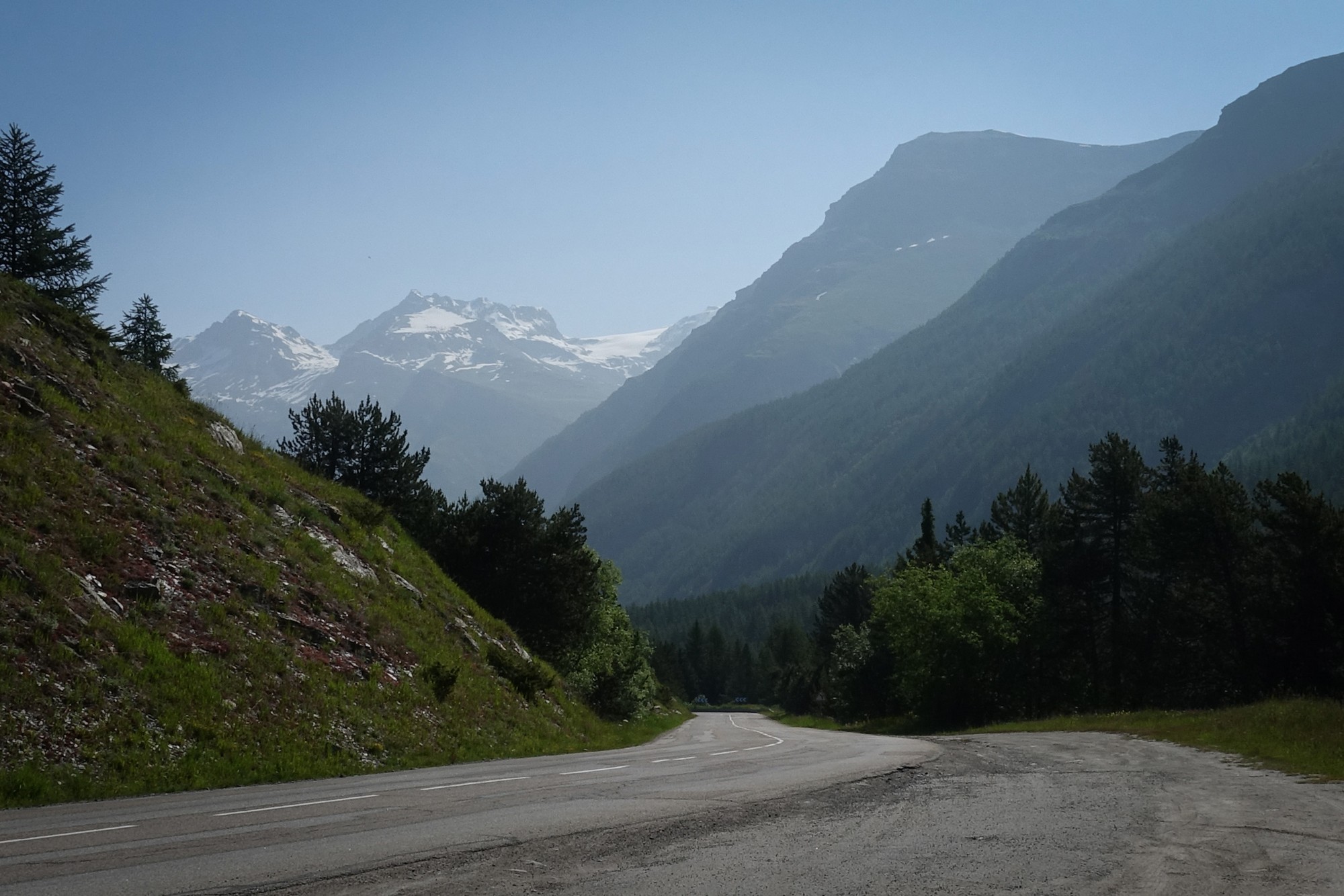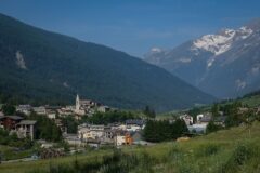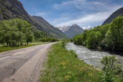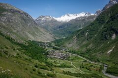 There is a slight descent from Col de la Madeleine, after which the road levels out for the next couple of miles to the village of Bessans. It remains fairly flat all the way to Bonneval-sur-Arc, another five miles along — the gentle gradient being typical of a road following a river upstream.