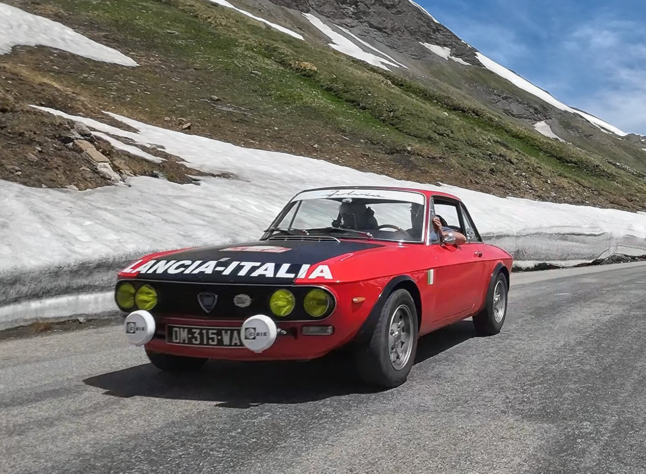 Fast at first down to Bonneval-sur-Arc, then back along that wonderful wide valley, the temperature now in the high 20s. Through Lanslebourg the Lancia Fulvia gang were once more in attendance.