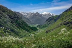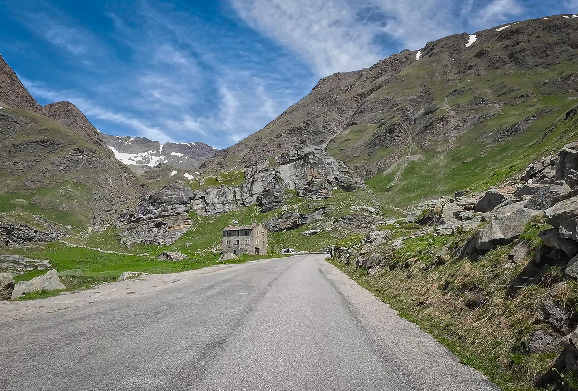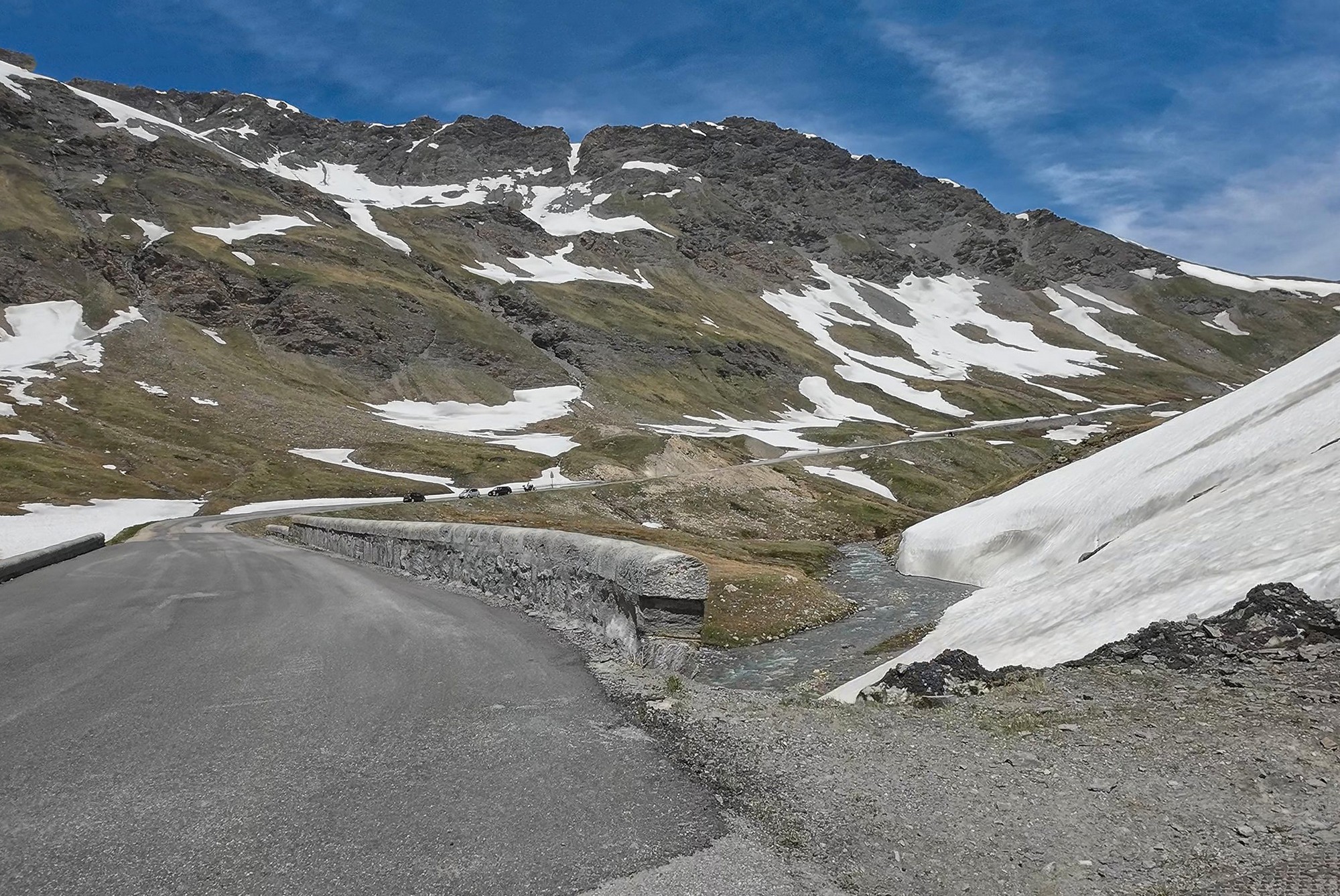 As the road climbed, green pasture gave way to lichen-stained rock, and then to the grey and white of bare mountainside, streaked with the remnants of winter snow.