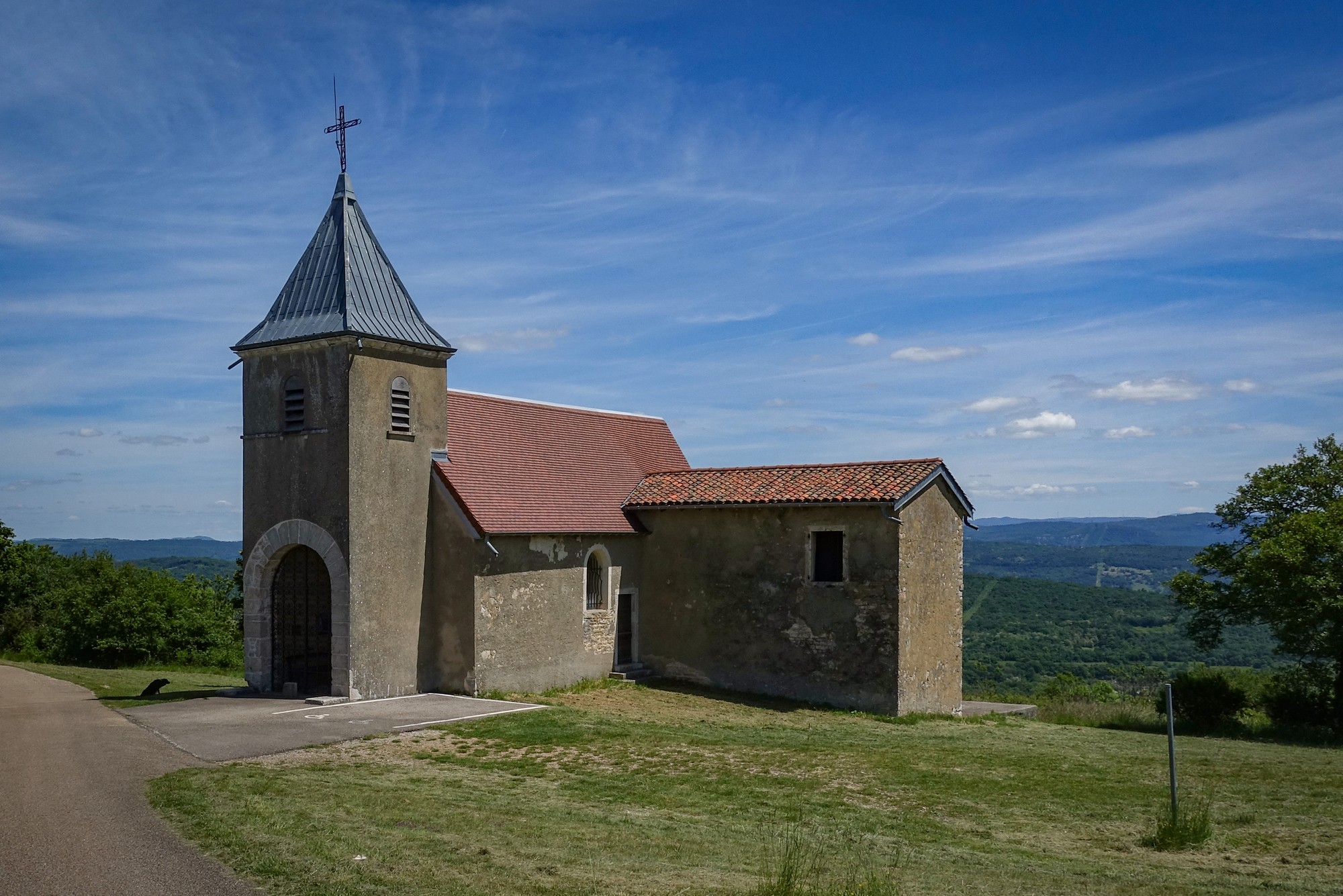 15:19 at Grand-Corent I’ve stopped at a village that looks like it’s the last one before the viaduct. After leaving the big aerial the road descended right down and off the edge of the Jura, essentially down onto La Bresse (a broad, low-lying plain between the Jura Mountains to the east and the Saône River to the west.)
