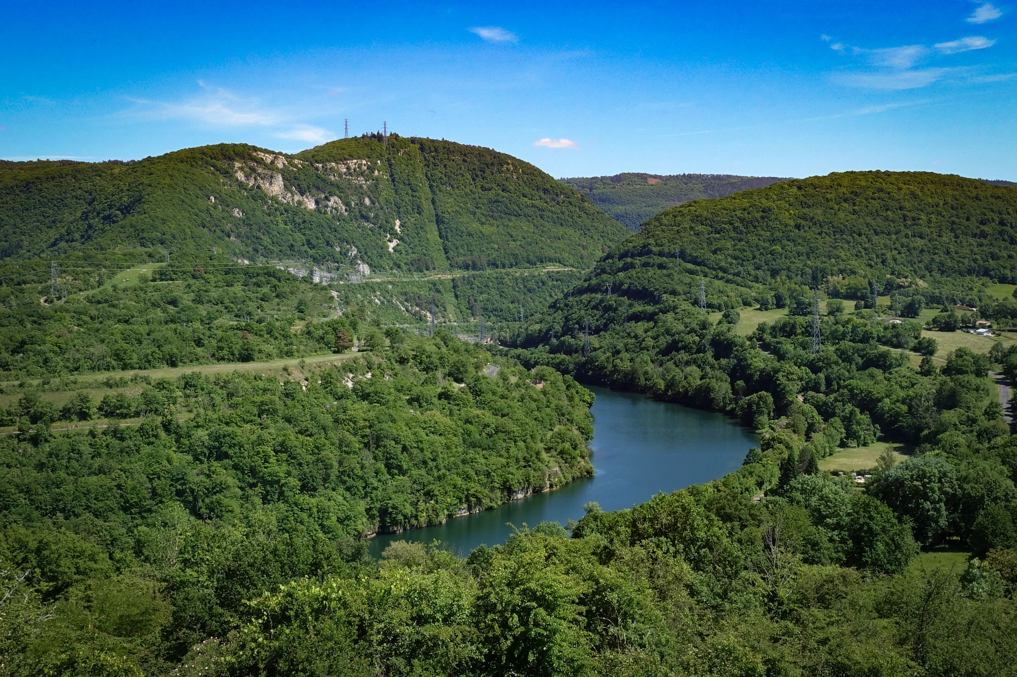 There’s a fair bit of traffic on that road – maybe a car every minute or so. Quite a few motorbikes out today, being a Saturday and with the sunshine. The descent from Col du Berthiand was absolutely amazing. There were lots of signs saying 15%, and I was doing 40 miles an hour for quite a long stretch. That would probably be quite a tough climb on that side. That descends down to a bridge, Pont de Serrières-sur-Ain, across the river Ain.