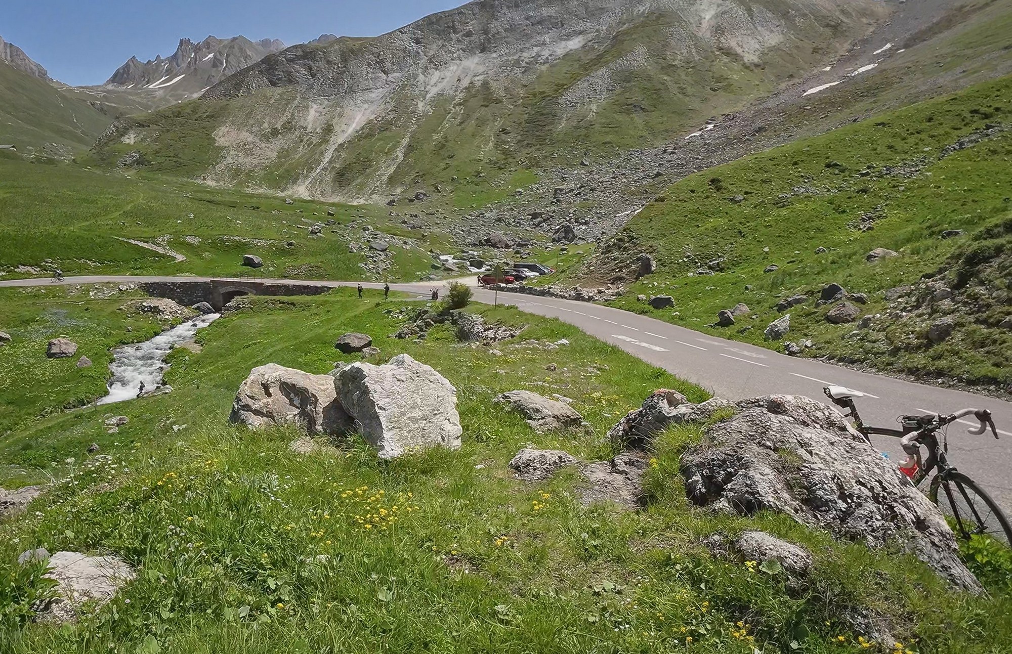 Six miles and just over an hour after leaving Valloire, I reached the last outpost of civilisation in the valley—the Auberge de Plan-Lachat. A couple of cars and a handful of cyclists had stopped there for lunch, but I rode straight past. Soon after came the Pont de la Valloirette, where the road finally stops shadowing the river, crosses over it, and doubles back on itself to begin the last slog towards the summit. The spot is strongly reminiscent of Pont Saint-Charles on the Col de l’Iseran climb from Val d’Isère.