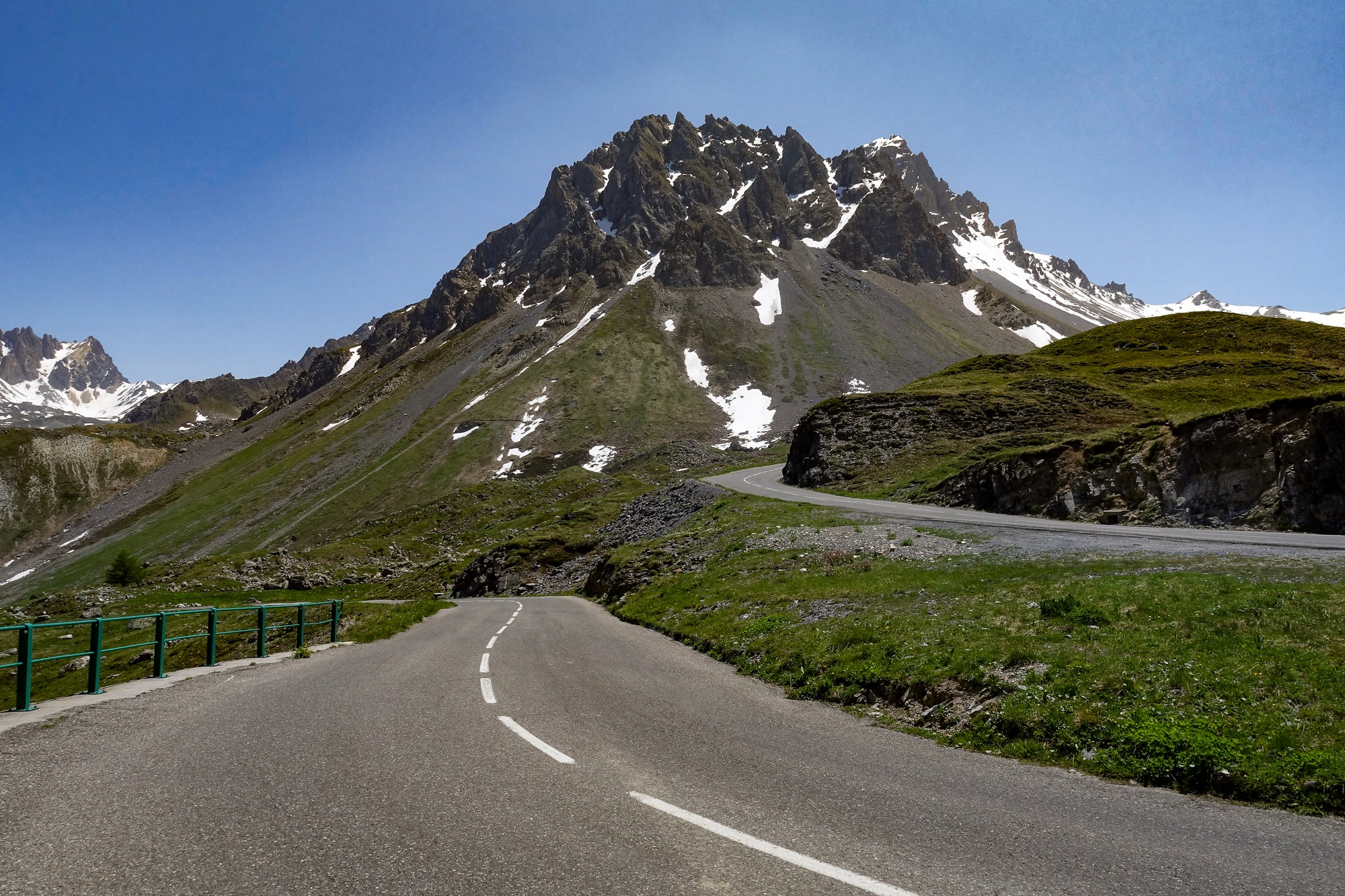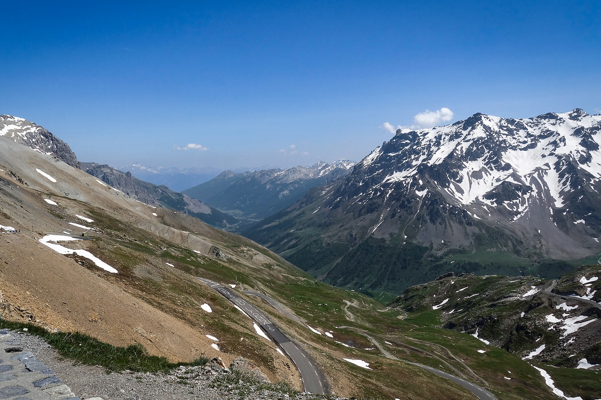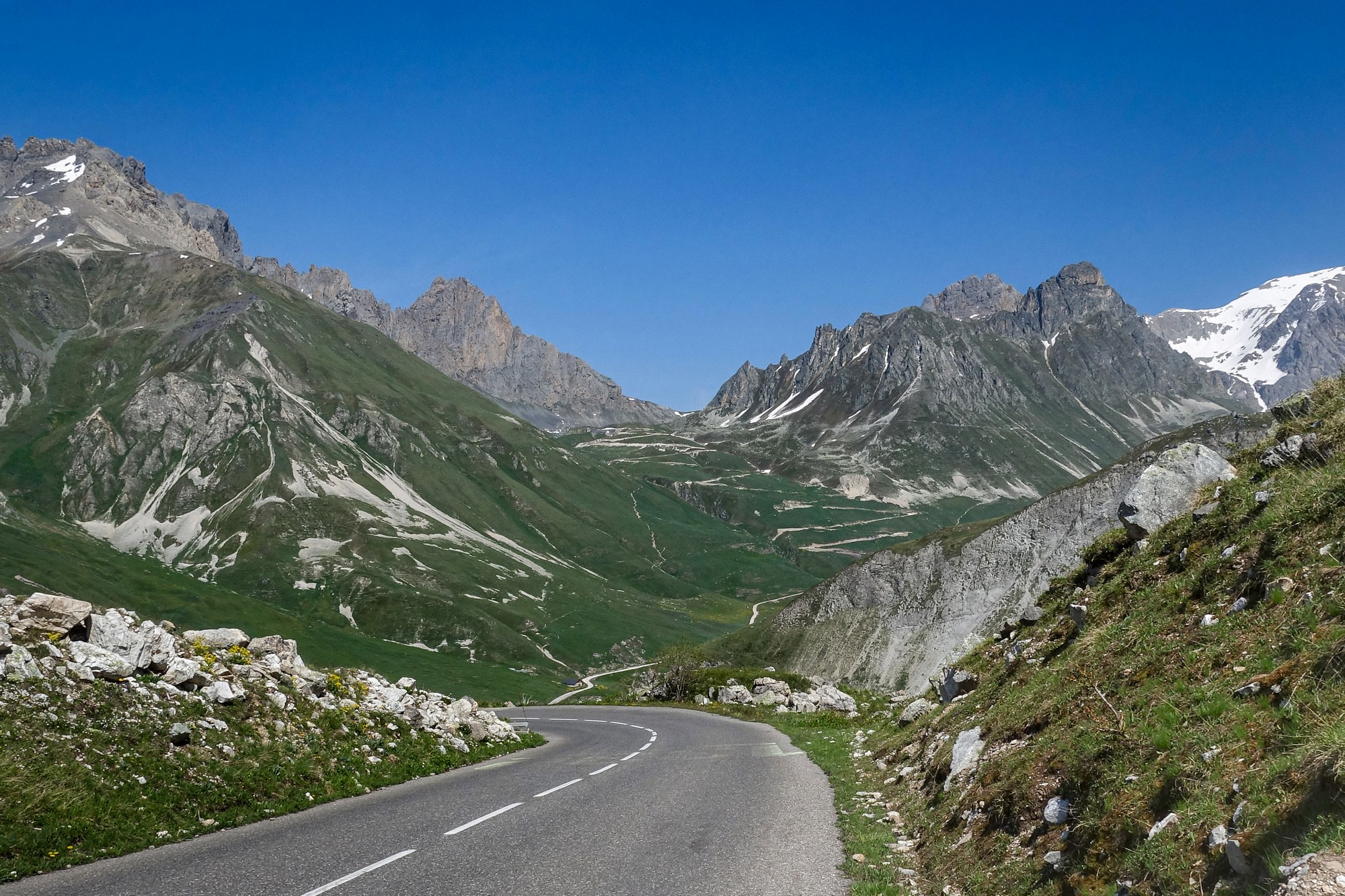 There’s a steep climb out of Valloire and after a couple of miles I found myself beyond the remaining chalets, etc. Then it’s a beautiful mountain road, heading south, still following the course of the Valloirette river on the right. There was virtually no shade, but the temperature was bearable and there was a slight tailwind. Aside from the occasional cyclist there was hardly any traffic.