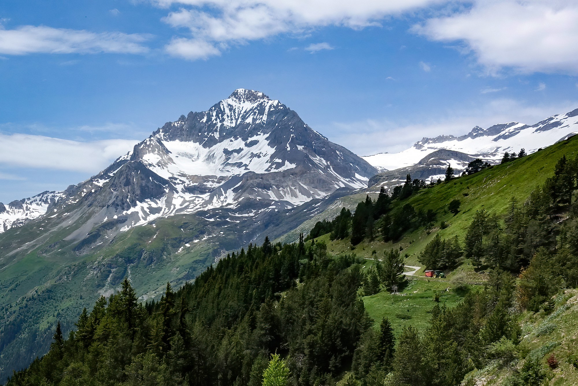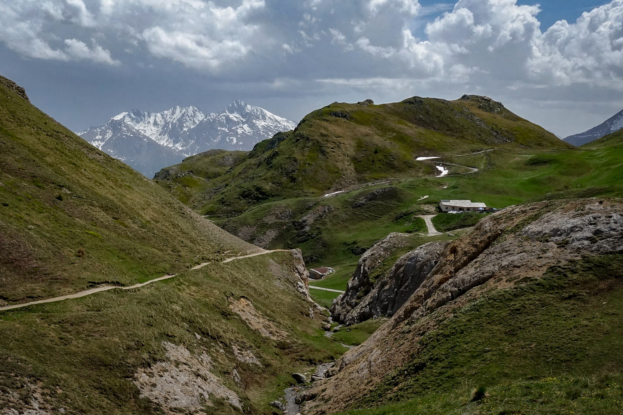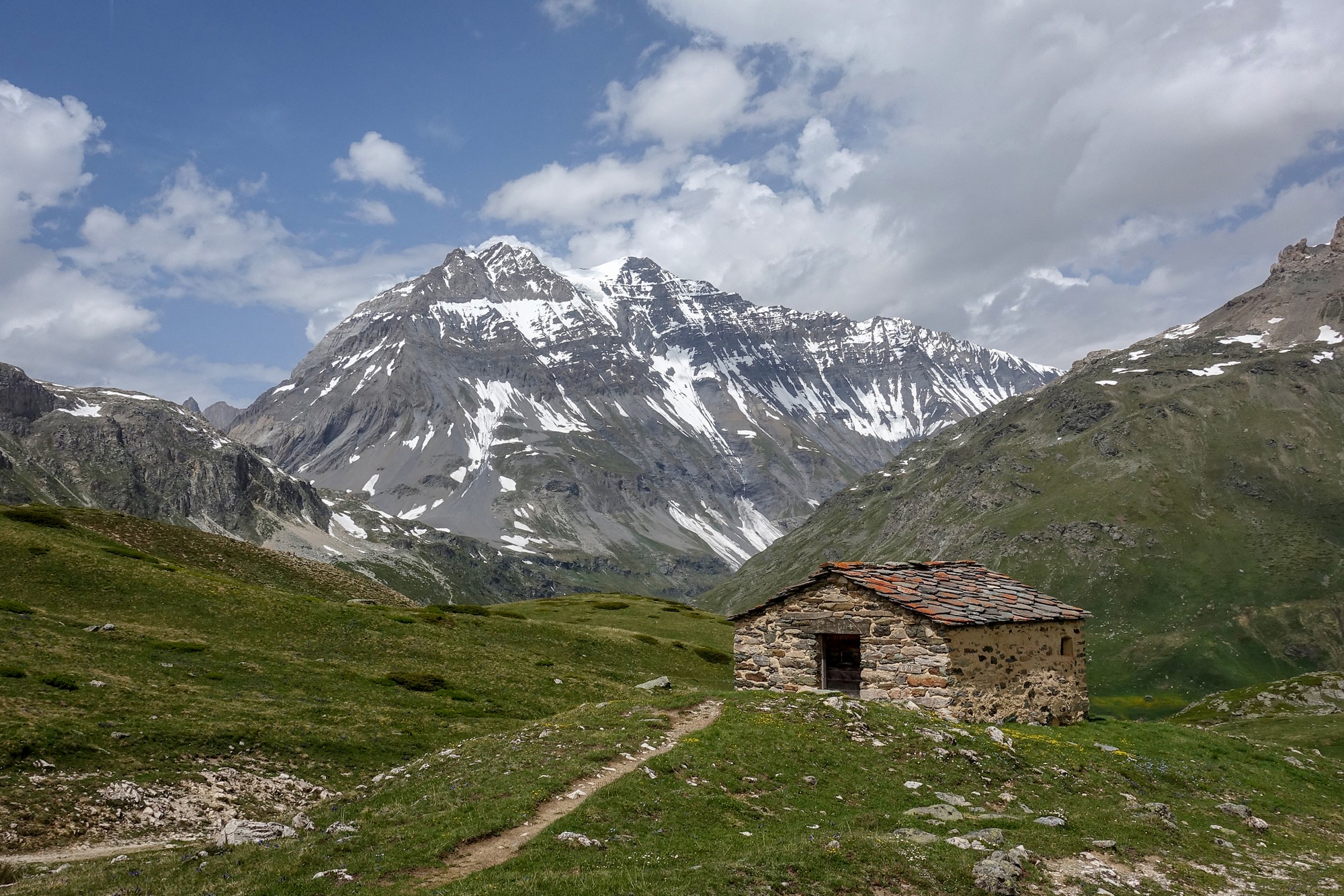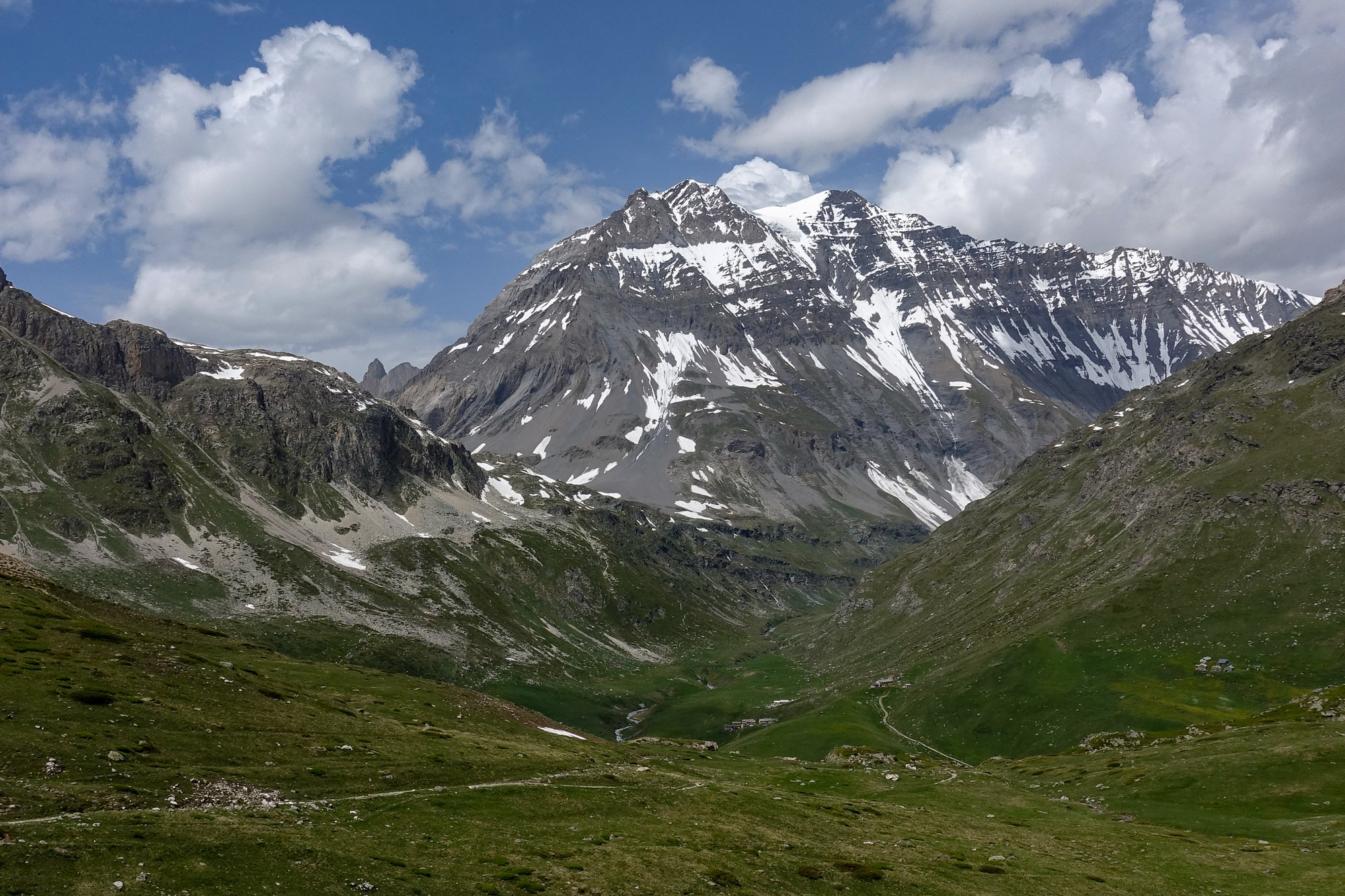 The view along Le vallon de La Rocheure was captivating. A track meandered into the distance, climbing towards the glaciers at the head of the valley. Scattered buildings petered out further up as lush green gave way to grey rock and white snow in the distance.