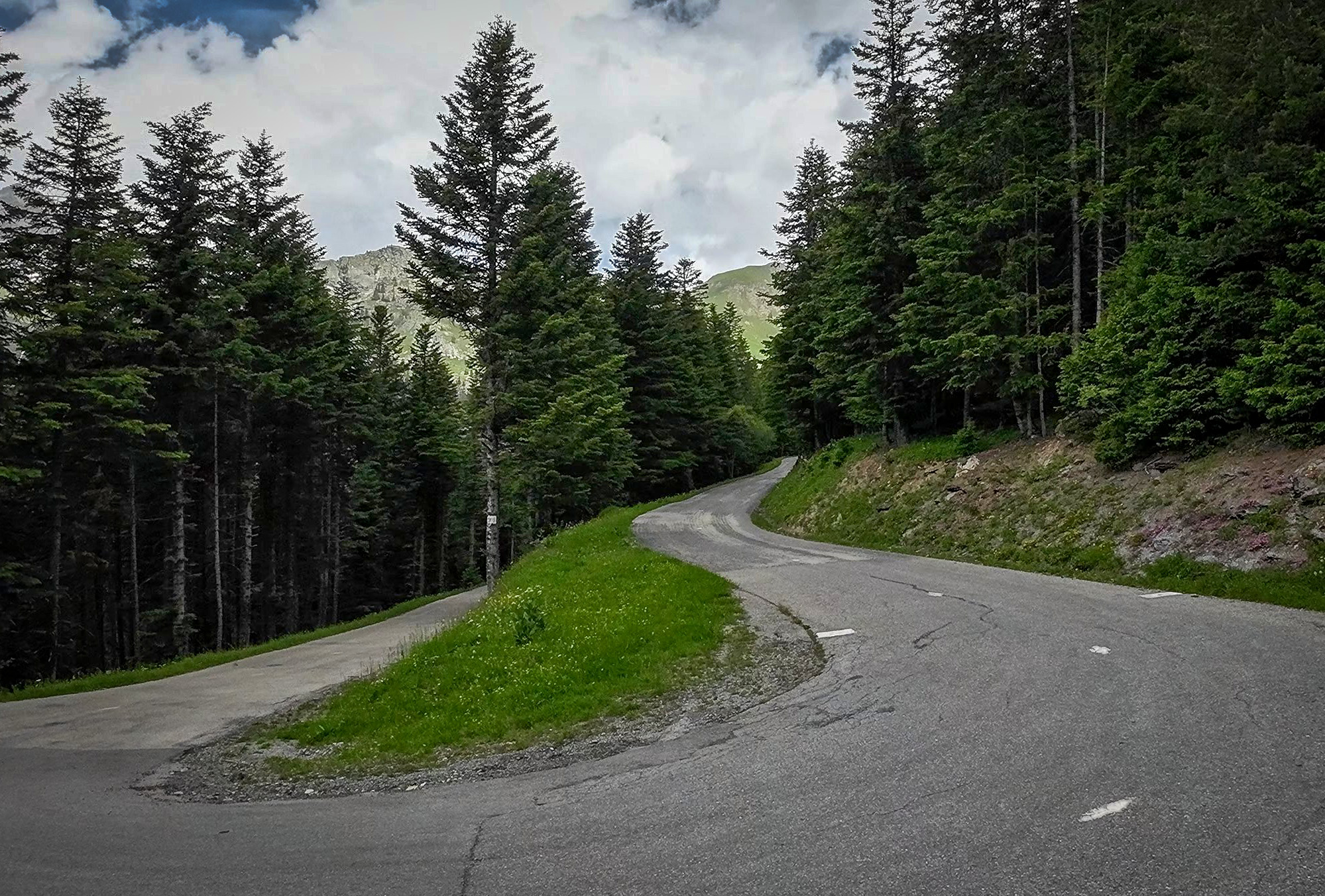 As the road clears the forest, it crosses the Ruisseau des Sallanches and doubles back on itself up the other side of the valley, now among pasture. After a short downhill dip the gradient picks up again for the last three miles to the col, the road twisting its way through the now tree-less landscape at a more palatable 7.5%.