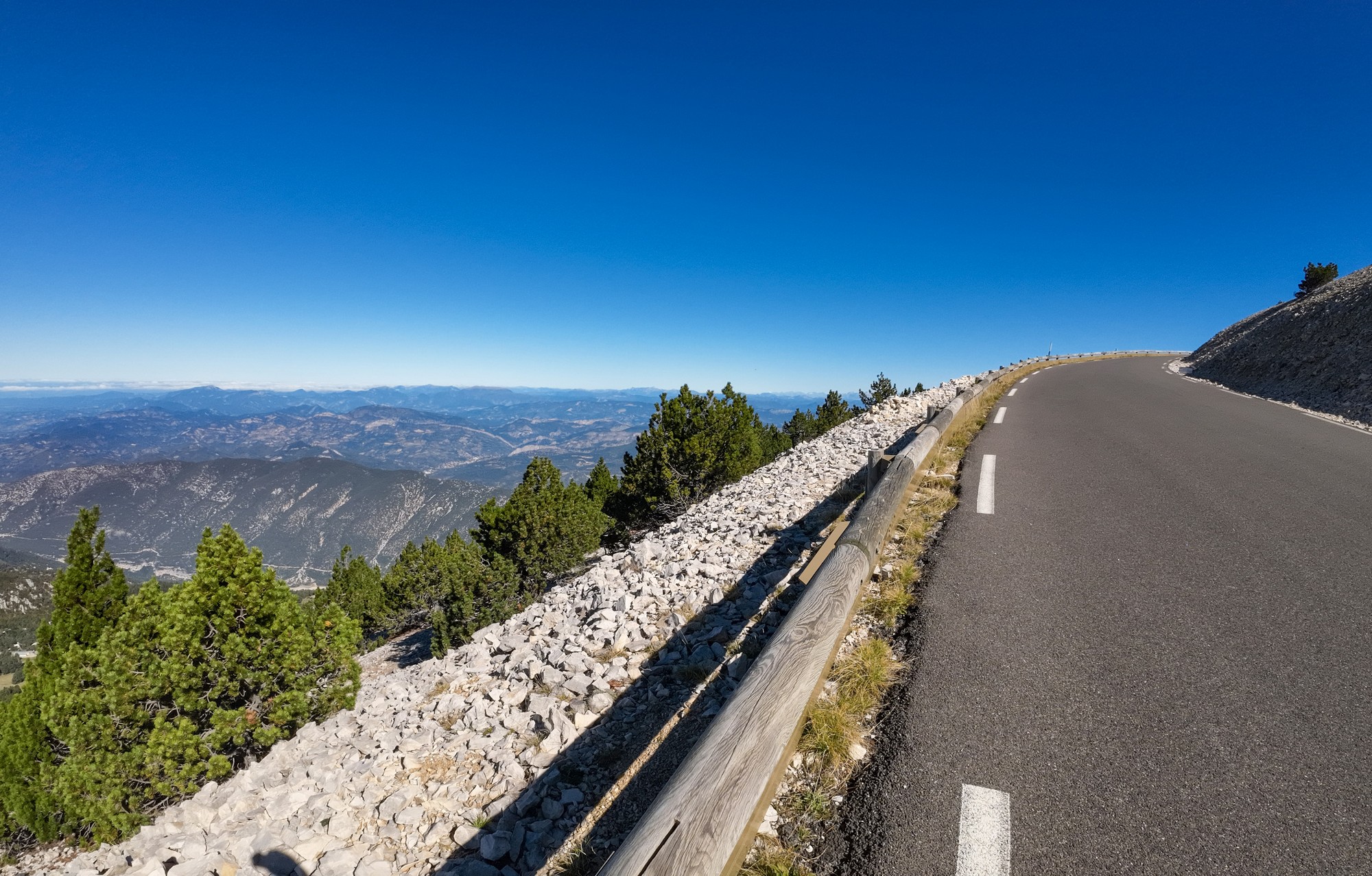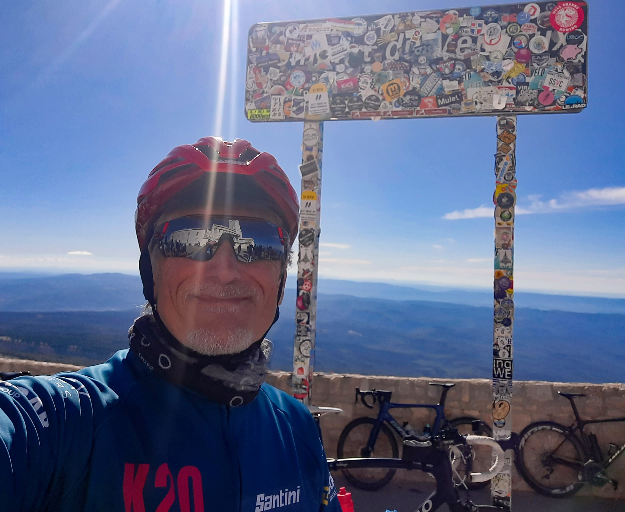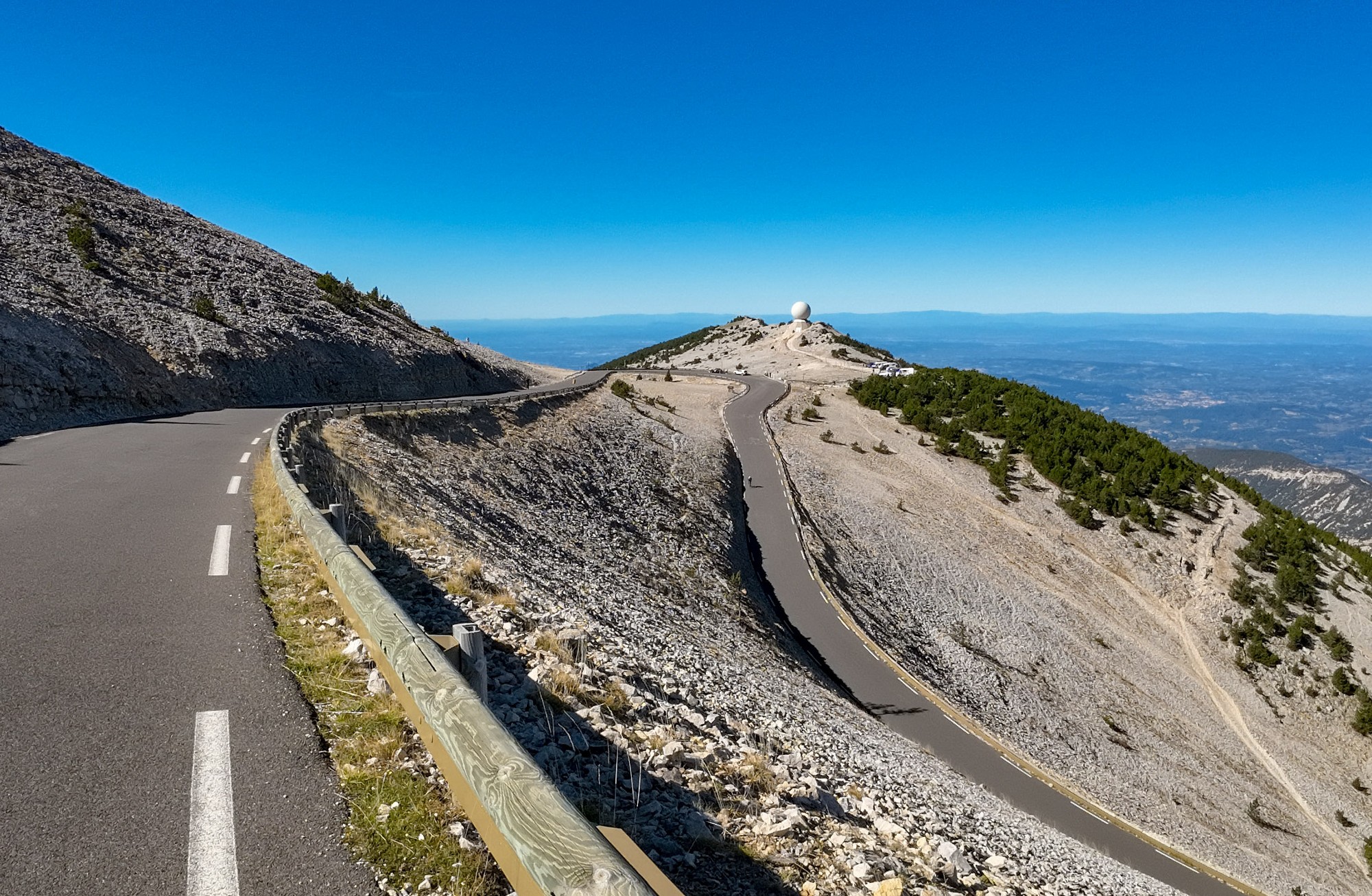 There were many more riders on the moonscape section to the top, obviously having started from Bédoin. That last section is 3.7 miles at 8%. It felt steeper than I had remembered, but was still manageable. The weather was perfect; wall-to-wall blue sky and barely any wind. 43 minutes of steady pedalling got me to the summit.