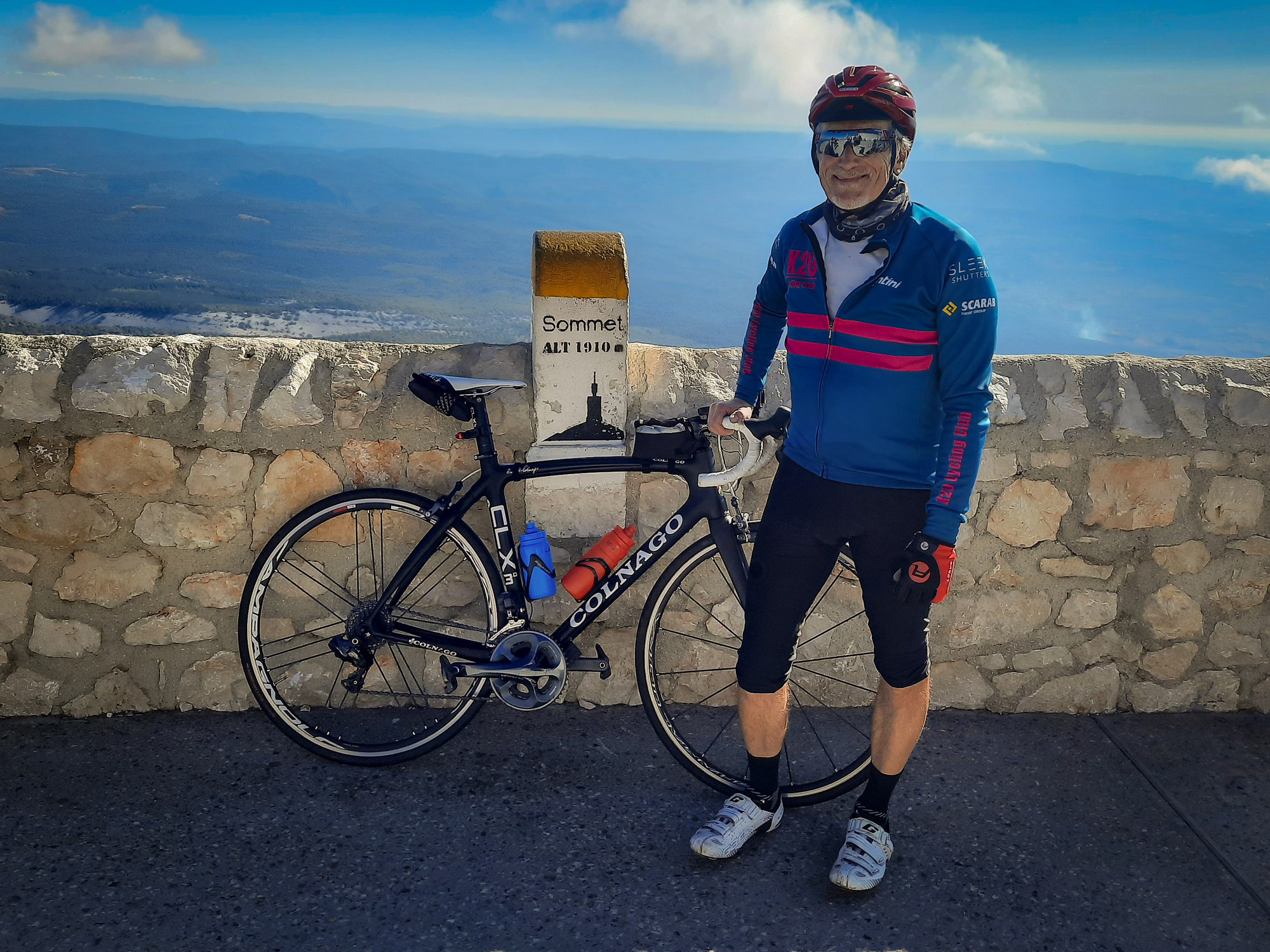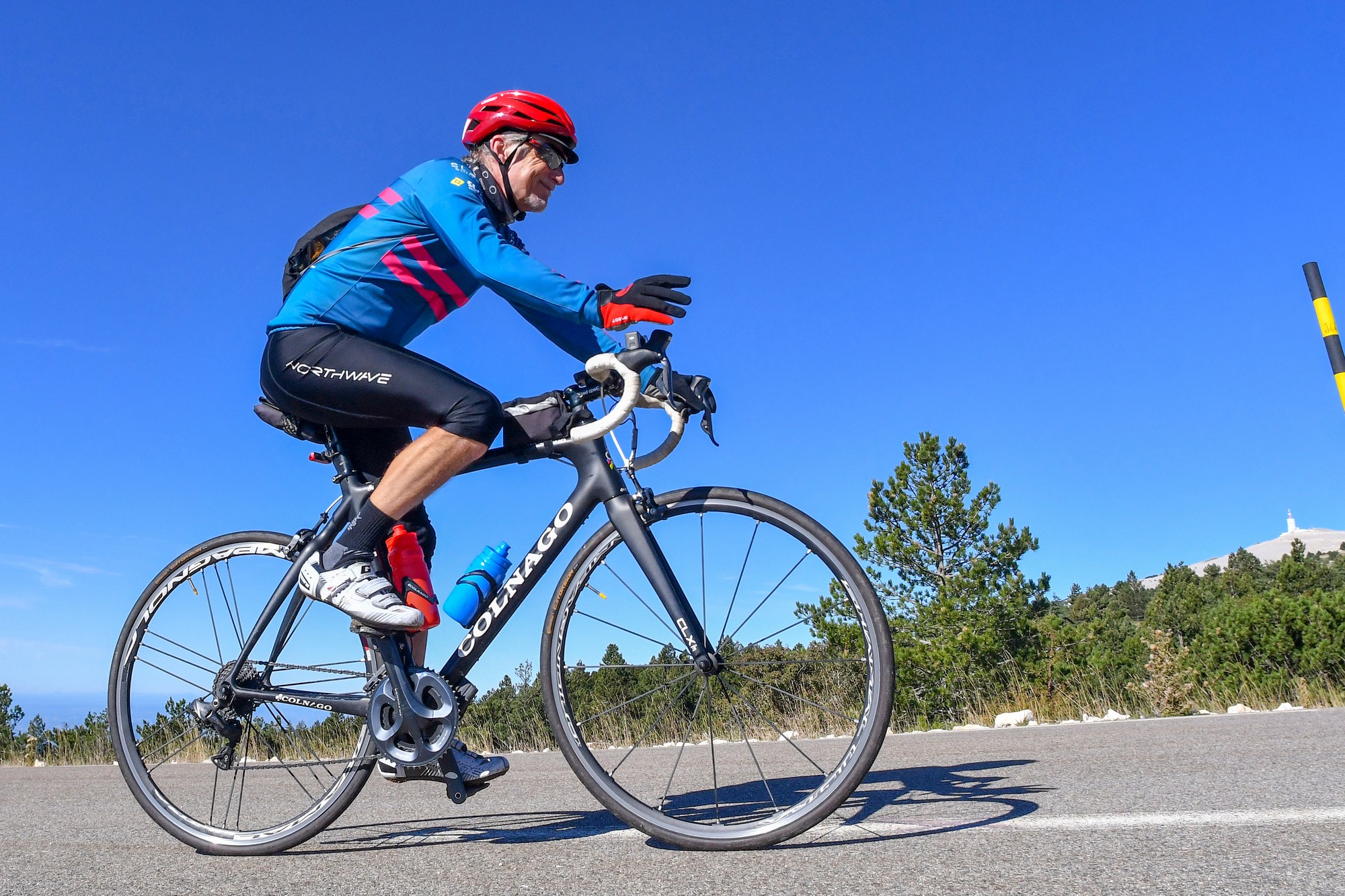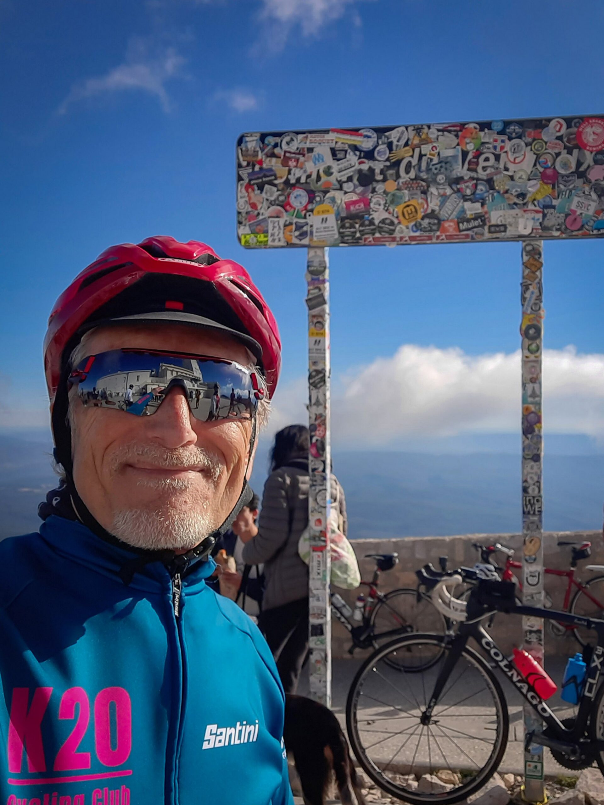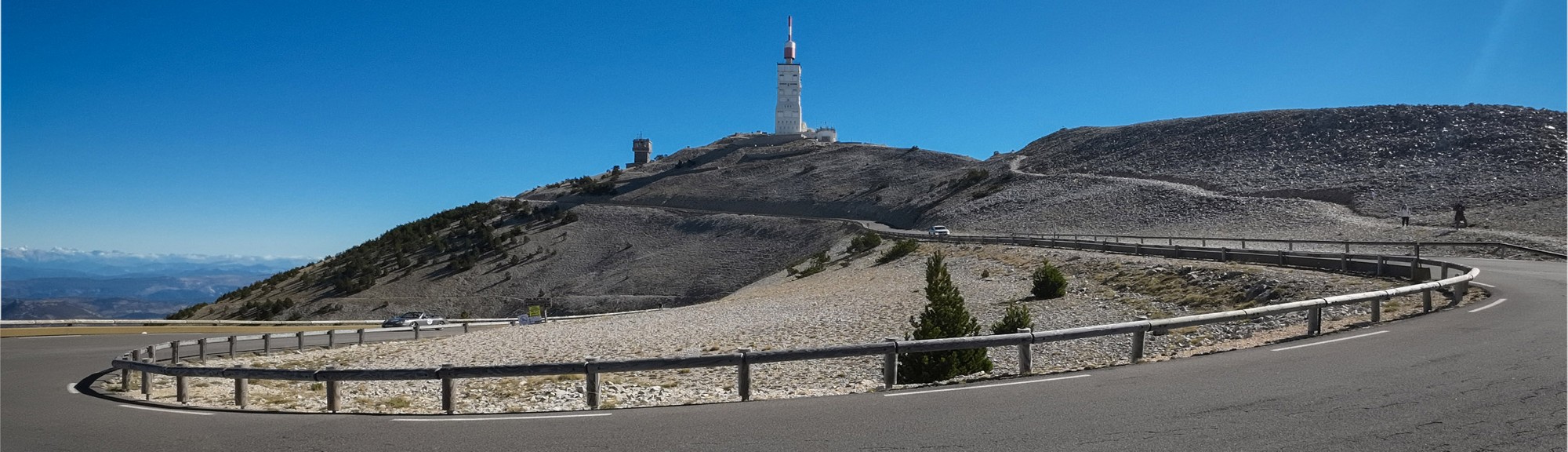 There were many more riders on the moonscape section to the top, obviously having started from Bédoin. That last section is 3.7 miles at 8%. It felt steeper than I had remembered, but was still manageable. The weather was perfect; wall-to-wall blue sky and barely any wind. 43 minutes of steady pedalling got me to the summit.