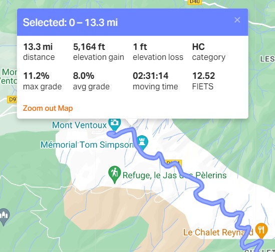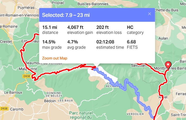 So the Malaucène ascent is 13.1 miles at 7.3%, whereas Bédoin was 13.3 at 8%, definitely tougher.