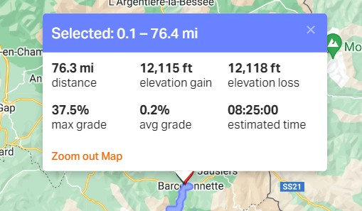 So Les Trois Cols was four miles longer with 1,500 ft more climbing. But that took me over 8.5 hrs moving time and over 2 hrs stopped, making 10:45 overall.